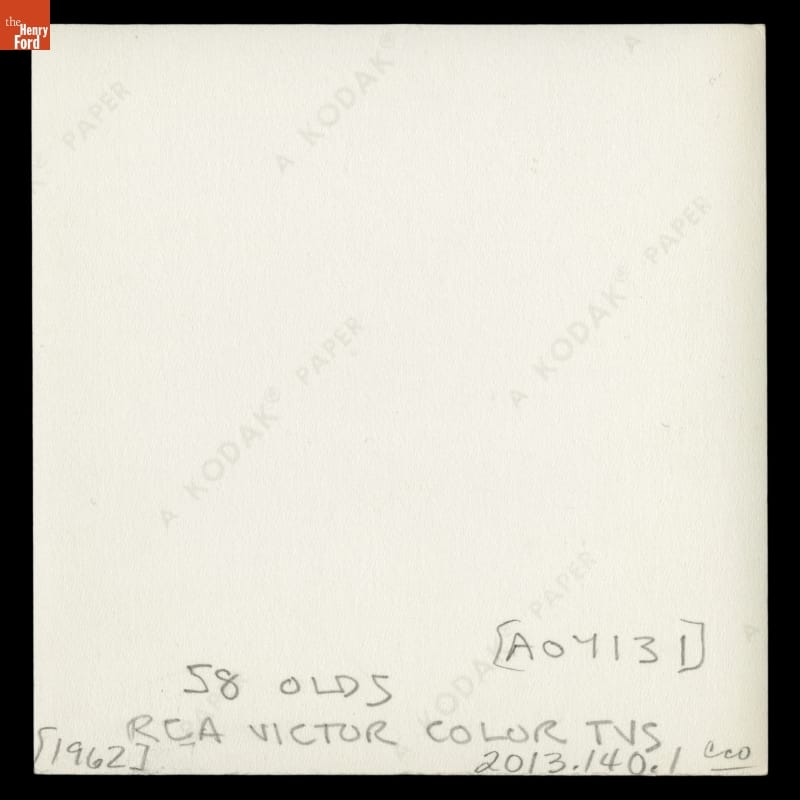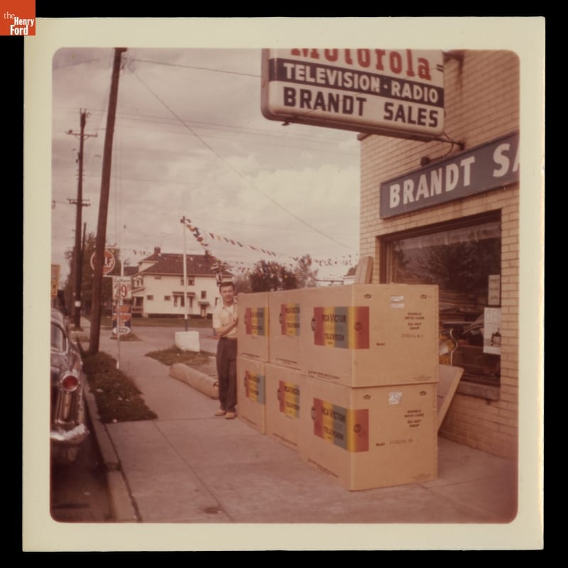 This image commemorates the celebratory arrival of a shipment of RCA Victor color televisions to a small electronics shop in Dayton, Ohio. In 1962, when this image was taken, color television in the home was still an exciting idea. Lowered costs for sets and regular programming in color led to a rise in customers investing in the now stable technology.