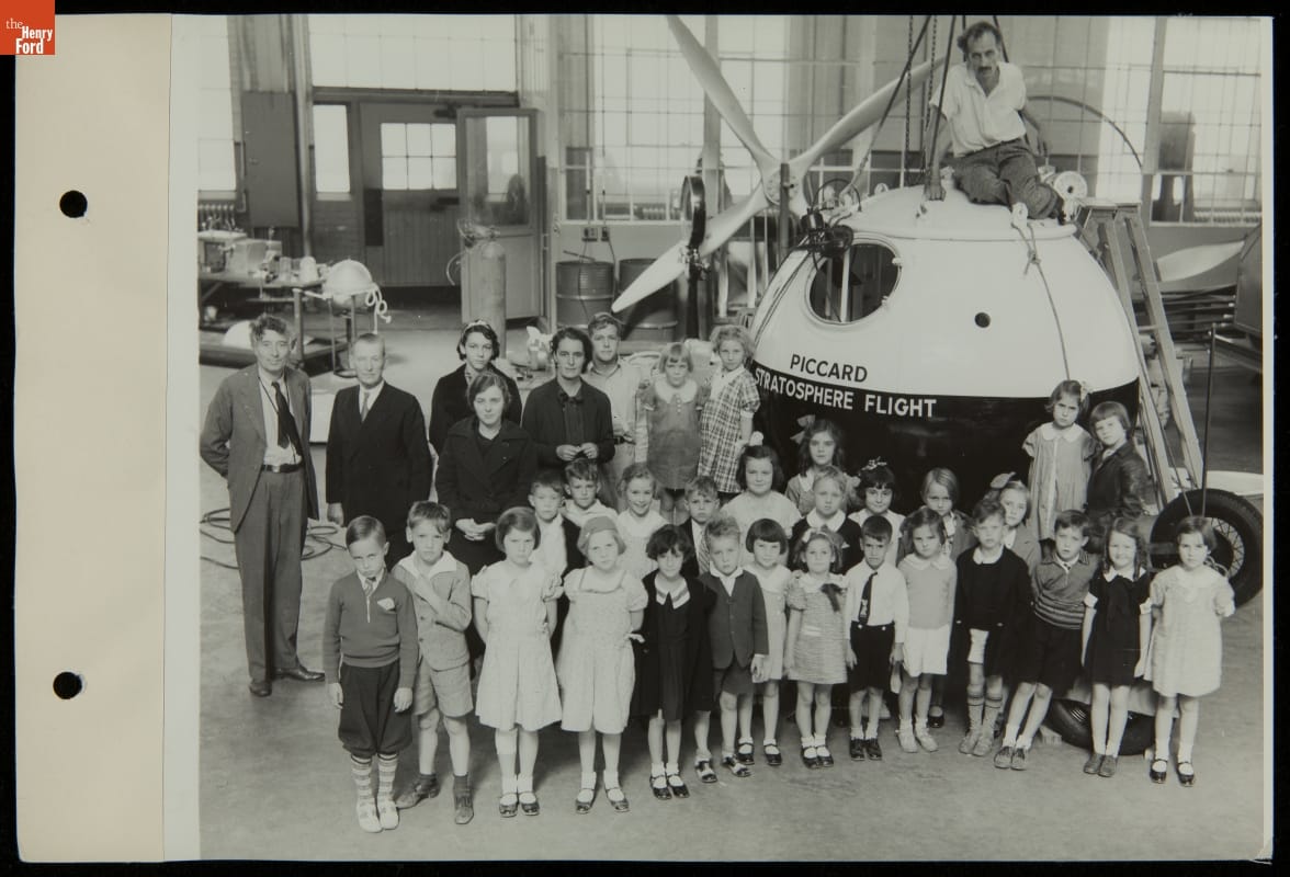 The Piccard stratosphere flight departed from Ford Airport field on October 23, 1934. Spouses Jean and Jeannette Piccard ascended 10.9 miles in a metal gondola carried by a hydrogen balloon. This image was taken at one of the airport's hangars in September of 1934, and depicts the Piccards with a group of visiting children from the Edison Institute School.