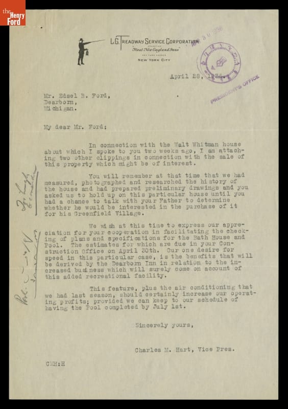 Letter from Charles Hart to Edsel Ford regarding Walt Whitman House, Pool and Bath House for Dearborn Inn, April 1936
