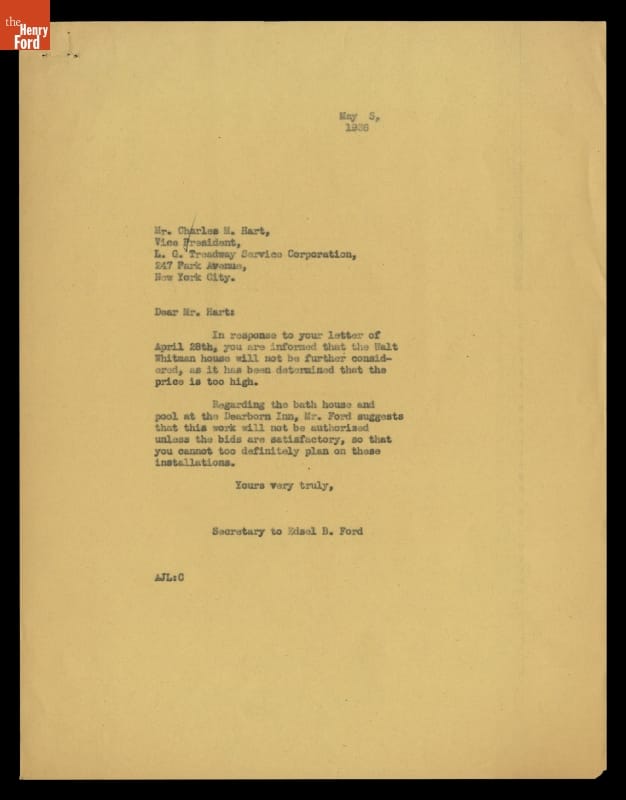 Letter from Edsel Ford's Office to Charles Hart regarding the Walt Whitman House, Pool and Bath House for Dearborn Inn, May 3, 1936