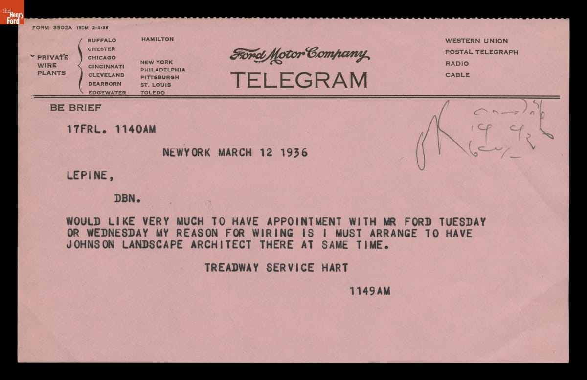 Telegram from Charles Hart to A. J. Lepine (for Edsel Ford) Arranging Meeting to Discuss Dearborn Inn Planning, March 12, 1936