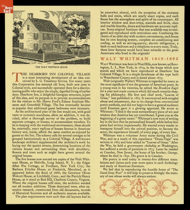 Brochure, "Some Facts regarding the Walt Whitman House," Dearborn Inn Colonial Village, 1937