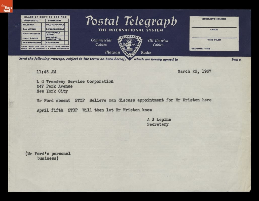 Telegram from A. J. Lepine (for Edsel Ford) to L. G. Treadway Service Arranging Meeting to Discuss Dearborn Inn Colonial Village, March 23, 1937