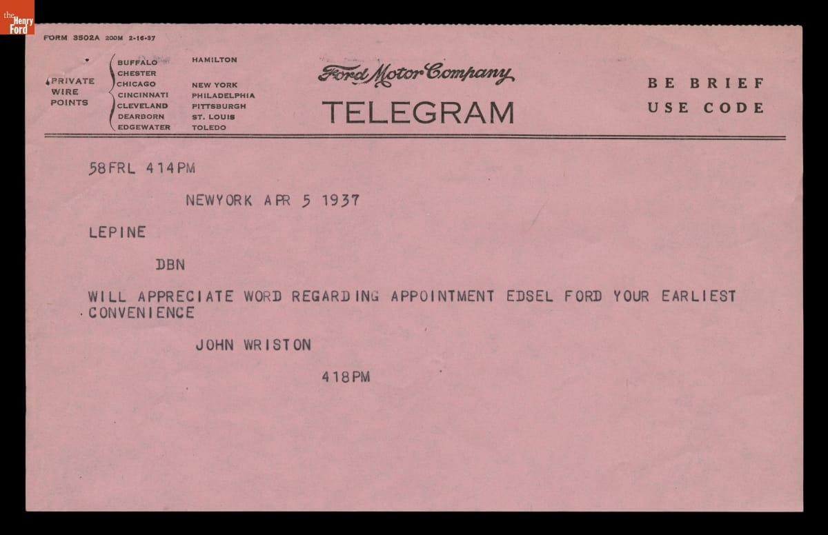 Telegram from John Wriston to A. J. Lepine (for Edsel Ford) Arranging Meeting to Discuss Dearborn Inn Colonial Village, April 5, 1937