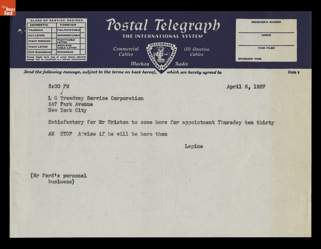Telegram from A. J. Lepine (for Edsel Ford) to L. G. Treadway Serivice Arranging Meeting to Discuss Dearborn Inn Colonial Village, April 6, 1937