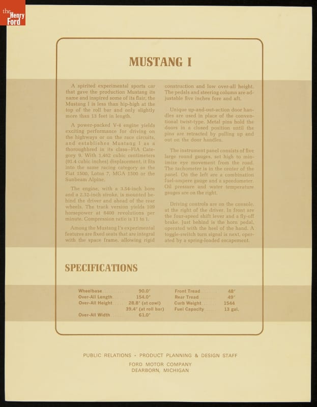 Informational Brochure, 1962 Ford Mustang I Experimental Sports Car, "Mustang I"