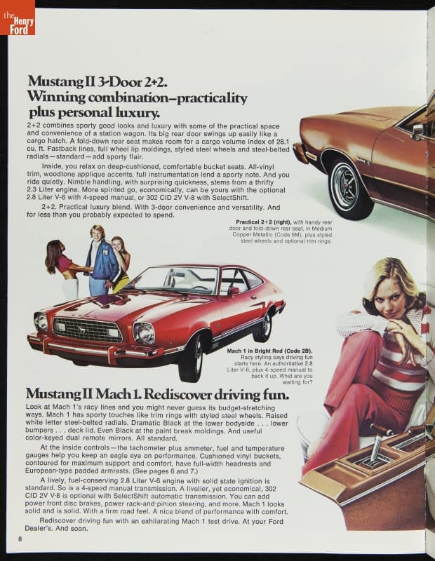 Measuring 19 inches shorter than its 1973 predecessor, the 1974 Mustang II returned the pony car to its compact roots. Ford advertised it as "the right car at the right time," and Mustang II's fuel-friendly inline-4 and V-6 engines were well suited to rising gas prices. The design remained in production through 1978, with an optional V-8 added for 1975.