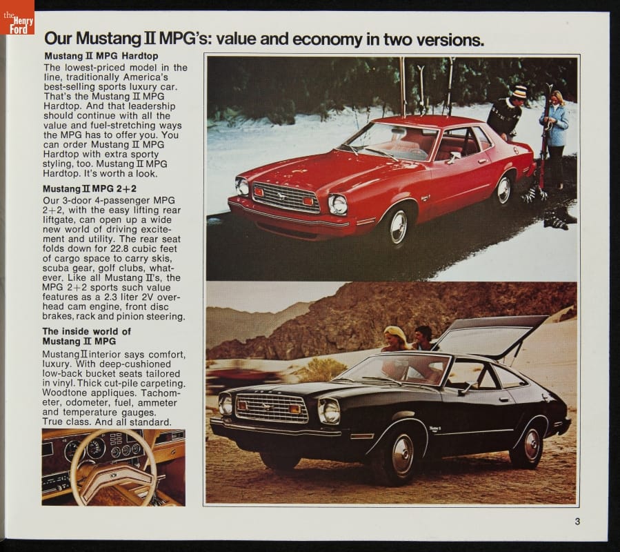 Measuring 19 inches shorter than its 1973 predecessor, the 1974 Mustang II returned the pony car to its compact roots. Ford advertised it as "the right car at the right time," and Mustang II's fuel-friendly inline-4 and V-6 engines were well suited to rising gas prices. The design remained in production through 1978, with an optional V-8 added for 1975.