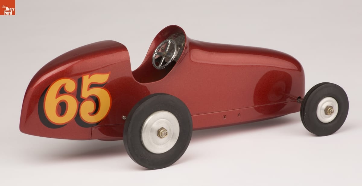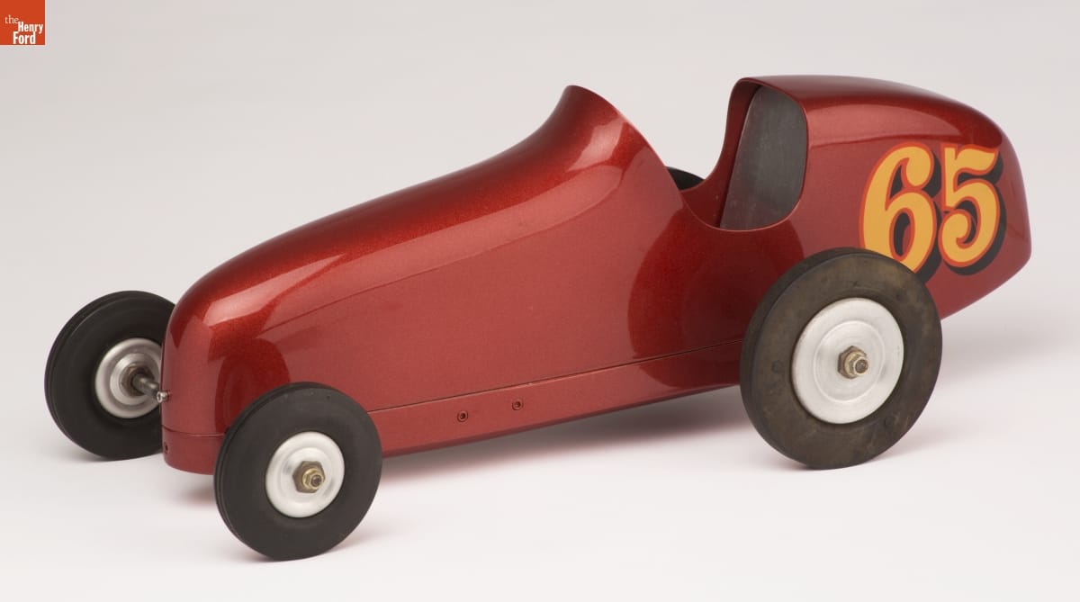 Tether cars, gas-powered model race cars, were popular in the 1930s and 1940s. They were raced individually while tethered to a central pivot, or against each other on a scaled-down board track. This model was produced by C & R Products Company of Hayward, California. C & R "Curly Cars" were nicknamed after company owner and racer Curly Glover.