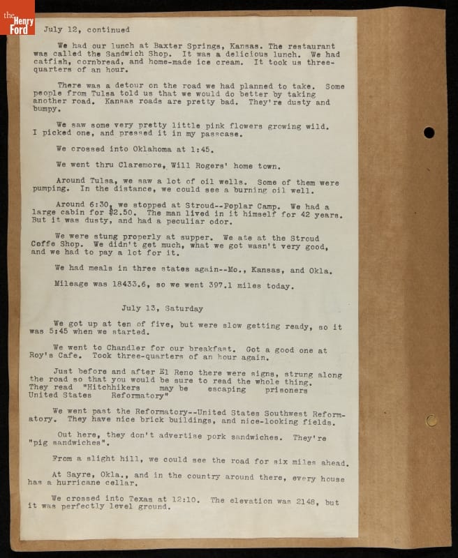 THF240570 / Travel Log of a Coast-to-Coast Automobile Round-Trip, July 9-August 13, 1935 / page 13, detail 1