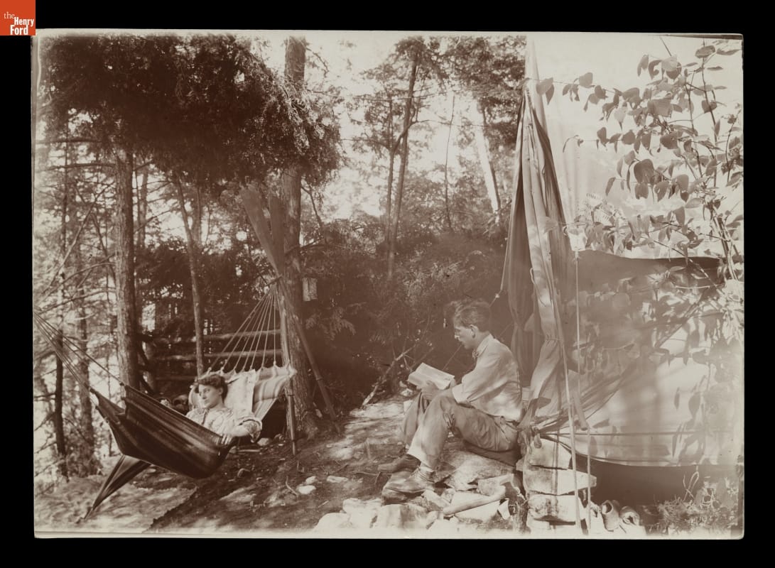 Camping out became a popular form of vacationing for city dwellers during the late 19th century. According to the rhetoric of the period, the couple camping in this secluded spot of Glen Eyrie, Lake George, New York, would find relief from the artificiality and confinement of the city and attain a more wholesome life by communing with nature.