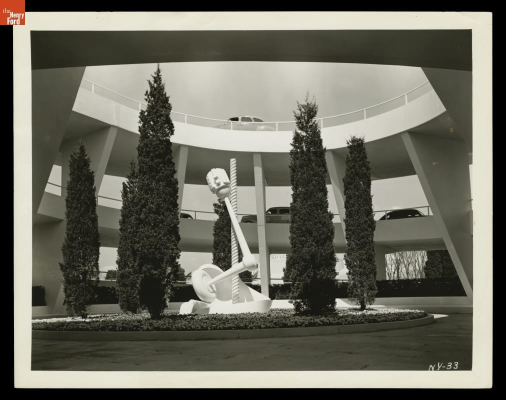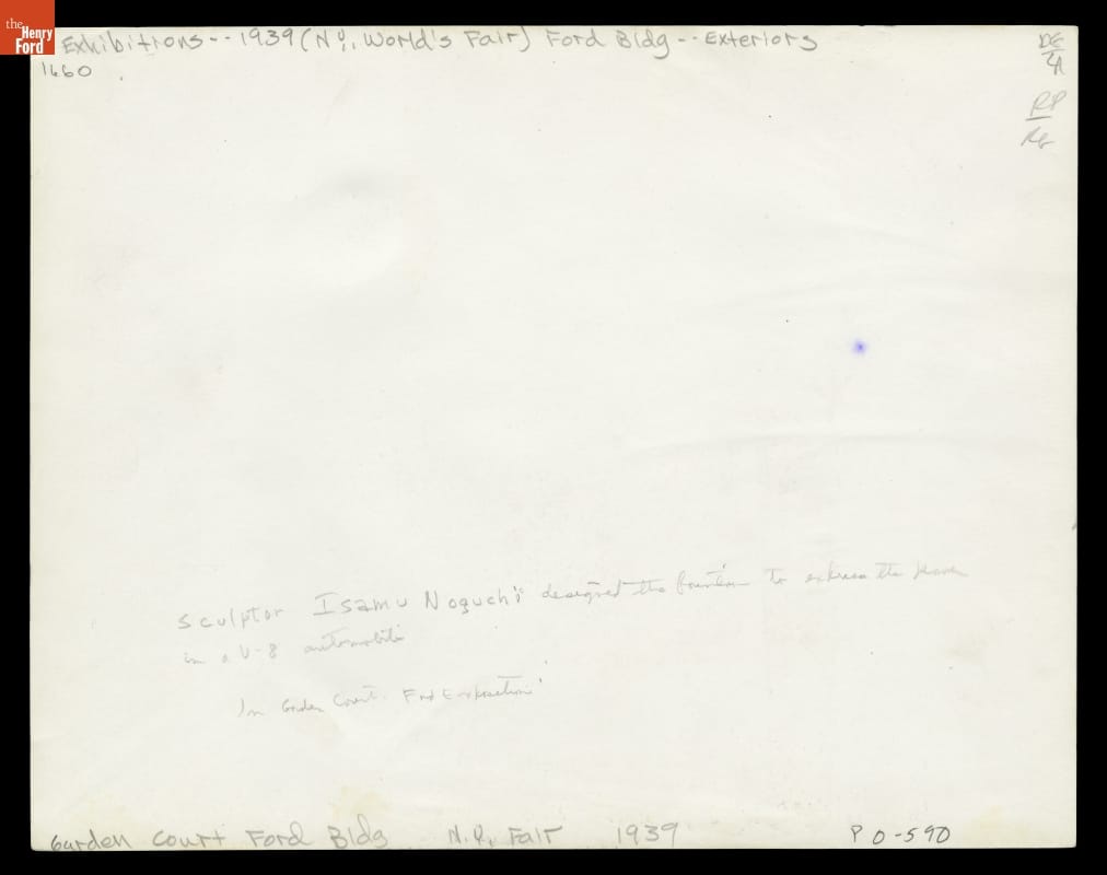 Ford Motor Company, a major participant in the 1939-40 New York World's Fair, hired sculptor Isamu Noguchi to design a fountain for its exhibition building in New York City's Flushing Meadows-Corona Park. Noguchi used automobile parts to create a fountain that both fit the fair's "Building the World of Tomorrow" theme and expressed the power of Ford's revolutionary V-8 engine.