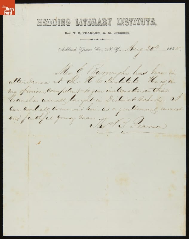 Before John Burroughs (1837-1921) became an internationally known naturalist and writer he earned a living as a teacher. From 1854 to 1863 Burroughs taught in district schools in New Jersey, Illinois, and his home state of New York. In late 1854, with money earned from his first teaching position, Burroughs attended Hedding Literary Institute. There, he received intensive instruction and obtained this recommendation.