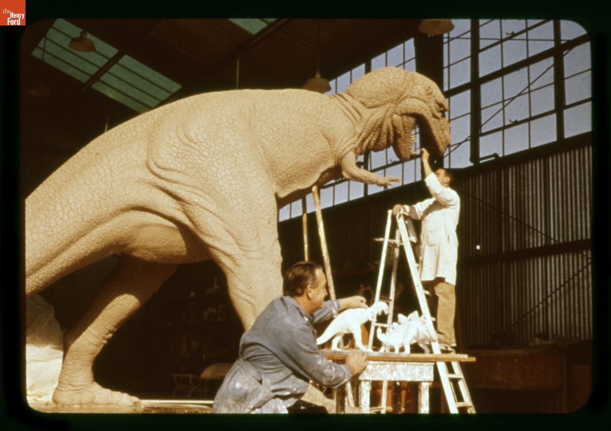 Disney Imagineers Constructing Dinosaur for the Magic Skyway Ride in the Ford Pavilion, 1964-1965 New York World's Fair