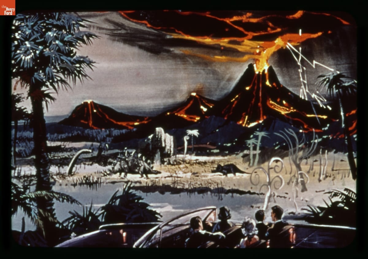 For its pavilion at the 1964-65 New York World's Fair, Ford Motor Company brought in Walt Disney to design a "unique and memorable entertainment adventure" that would outshine its competitors. This became the Magic Skyway ride, in which guests sat in Ford convertibles through a Disney-designed show. Guests emerged from a "time tunnel" to a primeval scene.