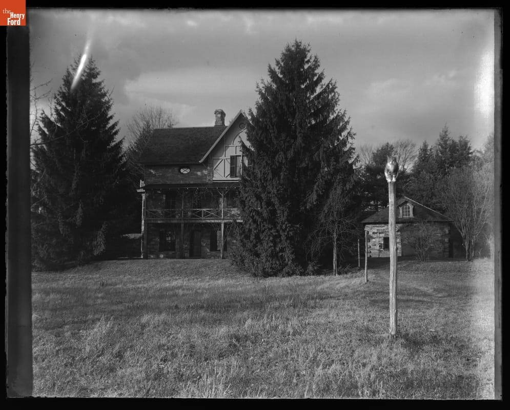 John Burroughs' House at Riverby, "Tom" Sitting on a Nearby Post, 1899