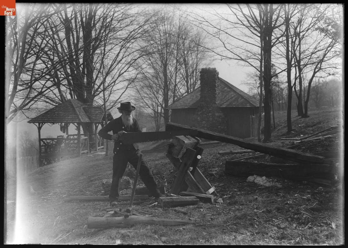 John Burroughs Sawing Wood near His Study at Riverby, 1910-1920