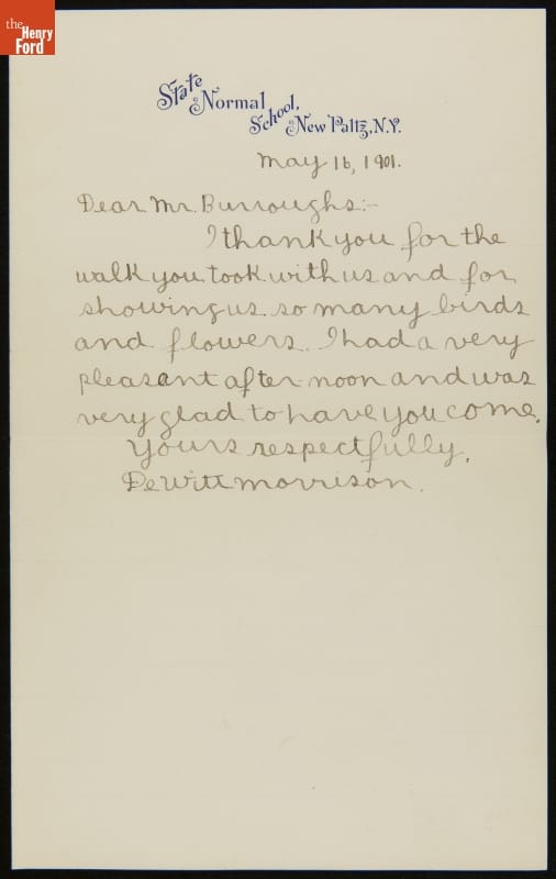 Letter to John Burroughs from Morrison DeWitt, a Student Thanking Him for a Nature Walk, May 16, 1901