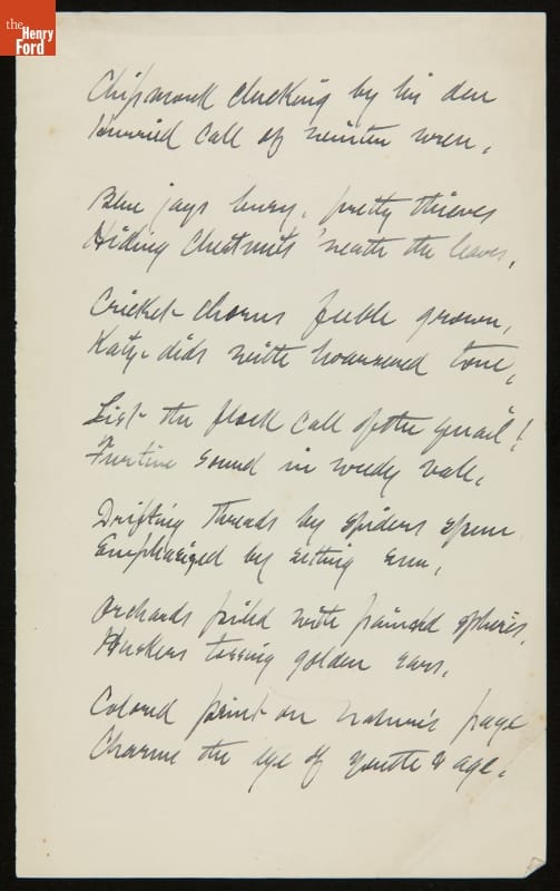 John Burroughs (1837-1921) was an internationally known naturalist and writer. Identified mainly as an essayist--a writing form at which he excelled, Burroughs' works also included poetry. Burroughs, however, felt out of his element writing poems and was often self-critical of his output. Nonetheless, he kept composing, creating these verses for his wife.