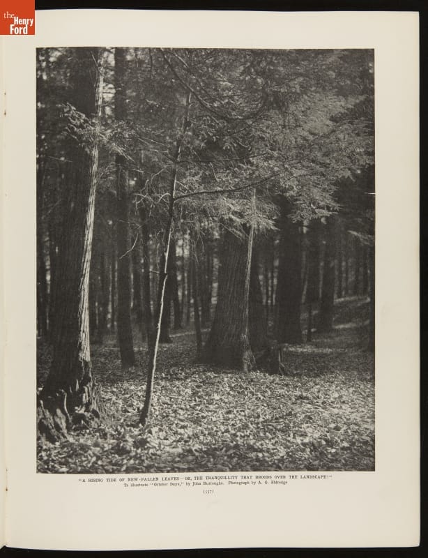 Magazine published by Review of REviews Book Company. Article "October Days" written by John Burroughs, with photograph by A. G. Eldridge.