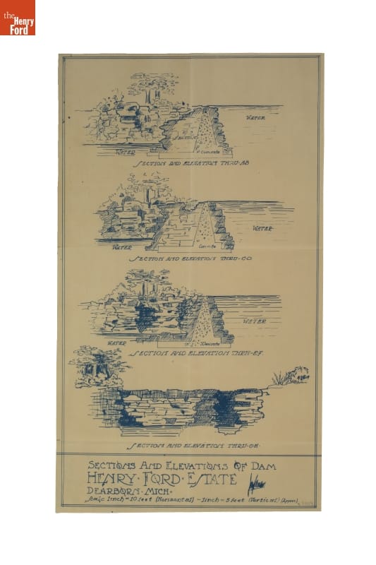 Landscape Architecture Drawing for Fair Lane, "Sections and Elevations of Dam, Henry Ford Estate," 1913-1915