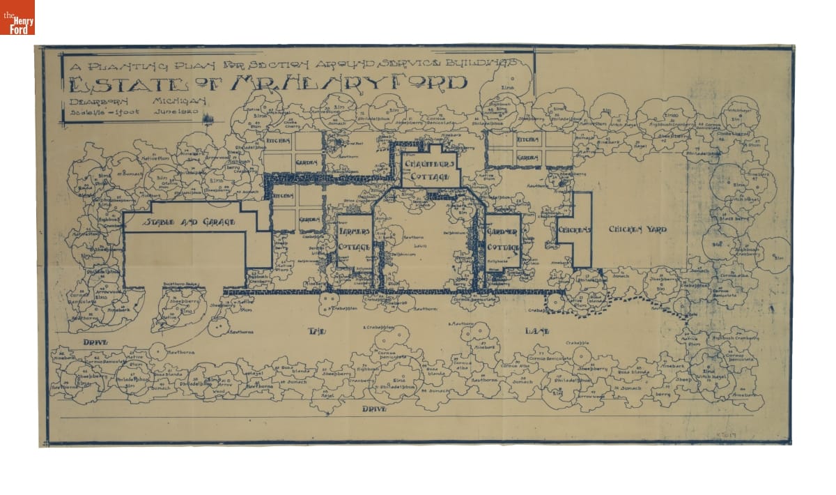 Henry and Clara Ford hired landscape architect Jens Jensen to design the grounds surrounding Fair Lane -- the Fords' 1300-acre Rouge River estate. Jensen created landscape drawings for many of the estate's natural areas. He also provided plans and drawings for landscaping around service areas, such as greenhouses, vegetable gardens, the powerhouse, and other support buildings.