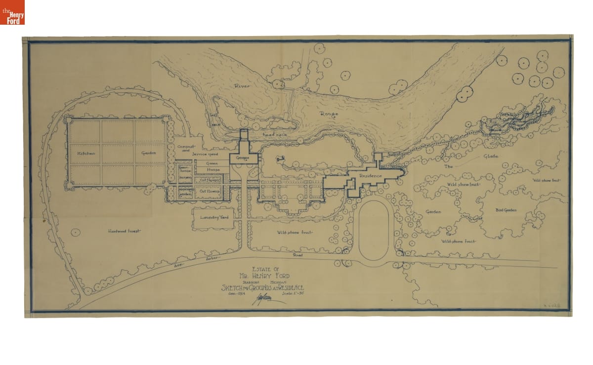 Henry and Clara Ford hired landscape architect Jens Jensen to design the grounds surrounding Fair Lane -- the Fords' 1300-acre Rouge River estate. Jensen envisioned naturalistic meadows, gardens, orchards, grottoes, and wandering paths for the nature-loving couple to enjoy. This drawing shows the proposed plans for the area around the Fords' 56-room mansion.