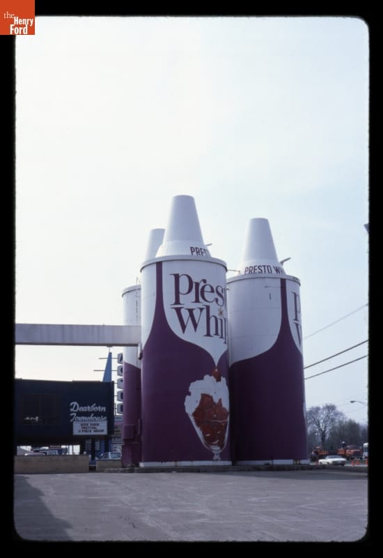Roadside photographer John Margolies documented the Presto Whip silos in front of the Delsoy Products (Whitehouse Products Incorporated) factory in Dearborn, Michigan. The silos held soybean oil and sugar -- ingredients in Presto Whip, a soy-based, non-dairy whipped topping. The company fashioned these eye-catching advertisements around ordinary storage tanks. The silos came down in the 1980s, but residents fondly remember the recognizable landmarks.