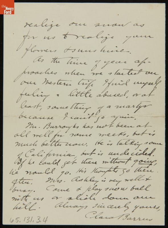 Dr. Clara Barrus was one of a small number of women who graduated from medical school in the late 19th century. In 1901, she began a close friendship with John Burroughs, the famous naturalist. Burroughs later named Barrus his literary executor and official biographer. Her correspondence covers a variety of subjects, including her relationship with Burroughs and her experiences setting up her own private sanatorium.