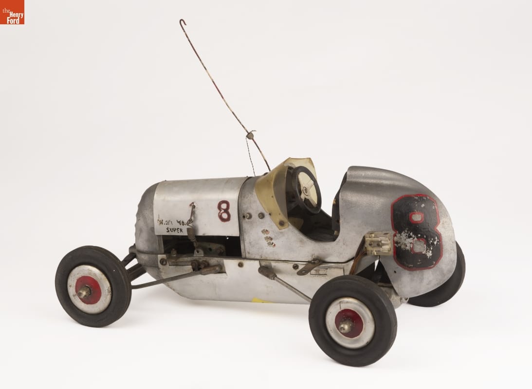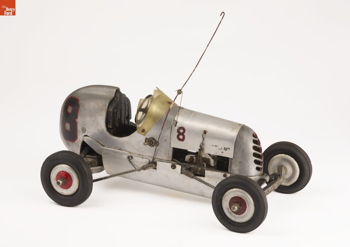 Tether cars, gas-powered model race cars, were popular in the 1930s and 1940s. They were raced individually while tethered to a central pivot, or against each other on a scaled-down board track. This model is one of approximately 1,500 units made by the Bremer Aluminum Foundry of Milwaukee, Wisconsin. Note the word "Whirlwind" cast into the front axle.