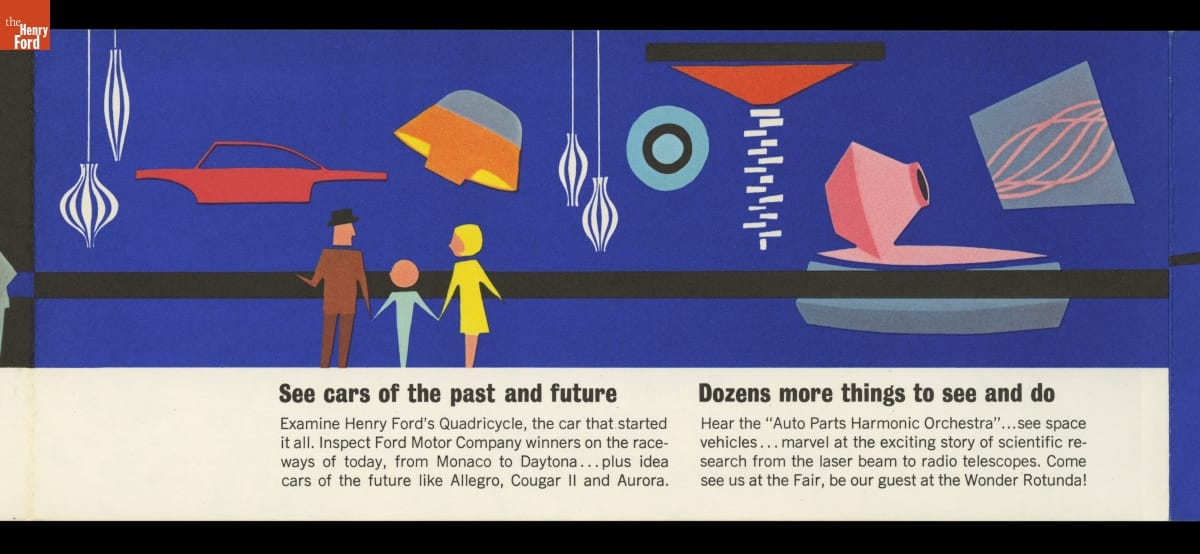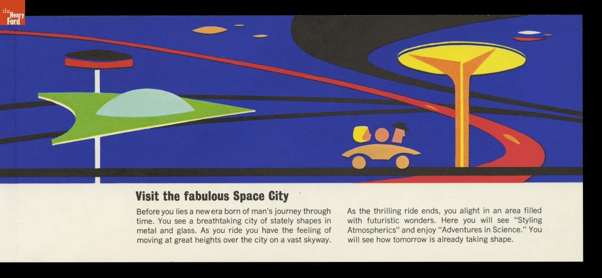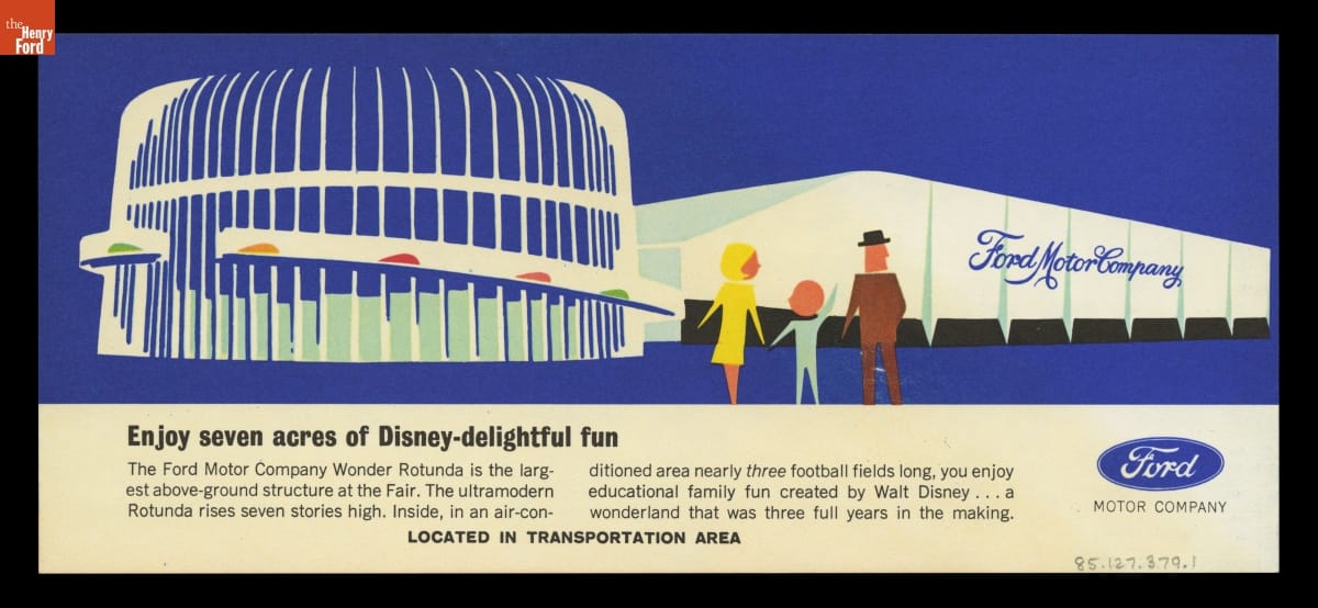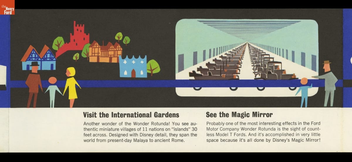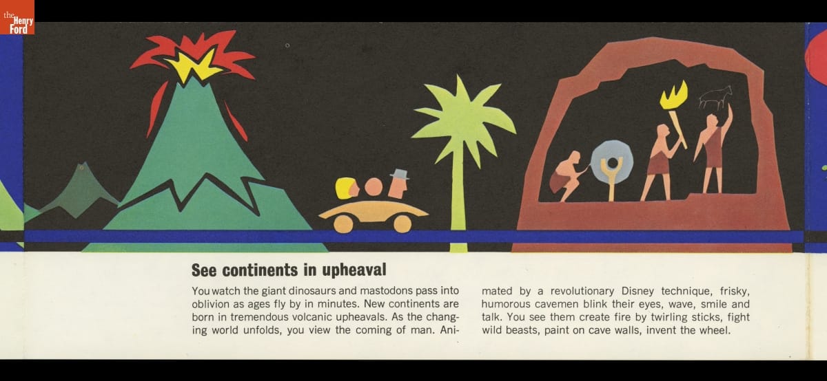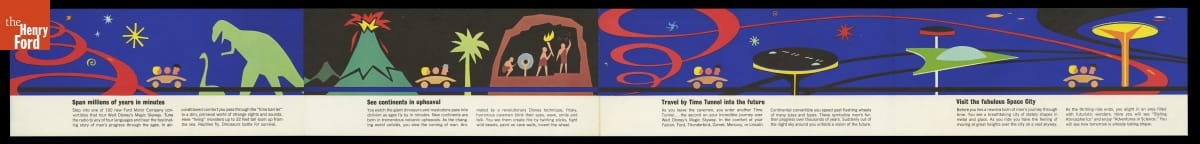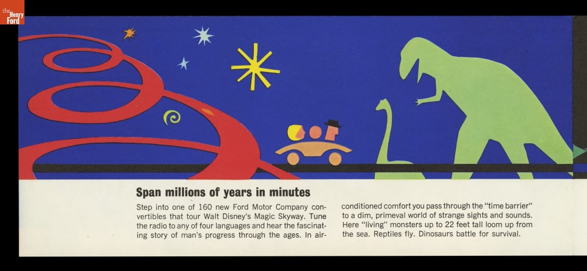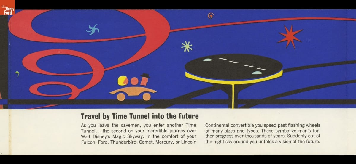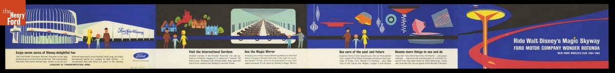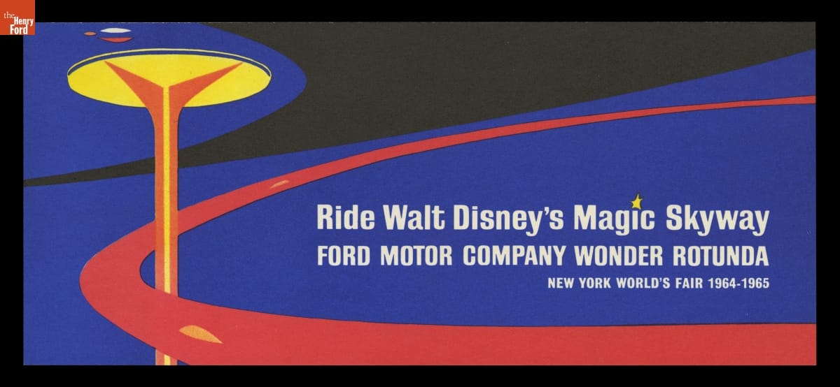 For its pavilion at the 1964-65 New York World's Fair, Ford Motor Company brought in Walt Disney to design a "unique and memorable entertainment adventure" that would outshine its competitors. This became the Magic Skyway ride, in which guests sat in Ford convertibles through a Disney-designed show. This souvenir brochure described the Ford pavilion and the Magic Skyway ride.