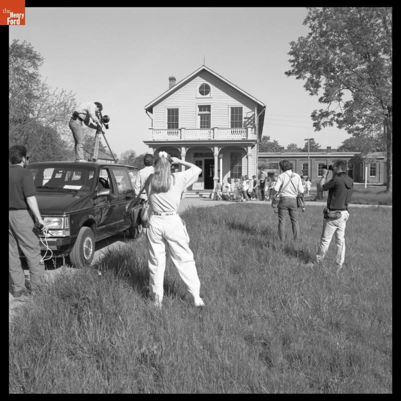 Filming ABC-TV's World of Discovery outside Menlo Park Laboratory in Greenfield Village, May 22, 1989