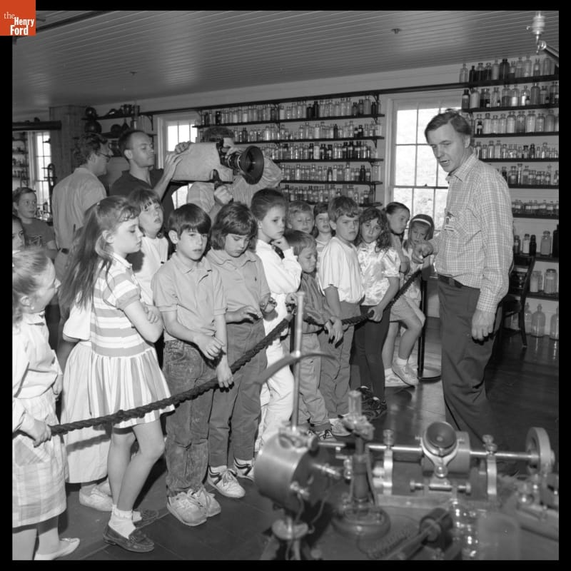 In May 1989, ABC television crews filmed segments of World of Discovery - Inventors: Out of their Minds at the Henry Ford Museum and Greenfield Village. The show linked the experiences of late 20th-century inventors with Thomas Edison's innovative work. In one of the program's final segments, museum curator John Bowditch explains Edison's greatest invention -- the research laboratory -- to a group of students.