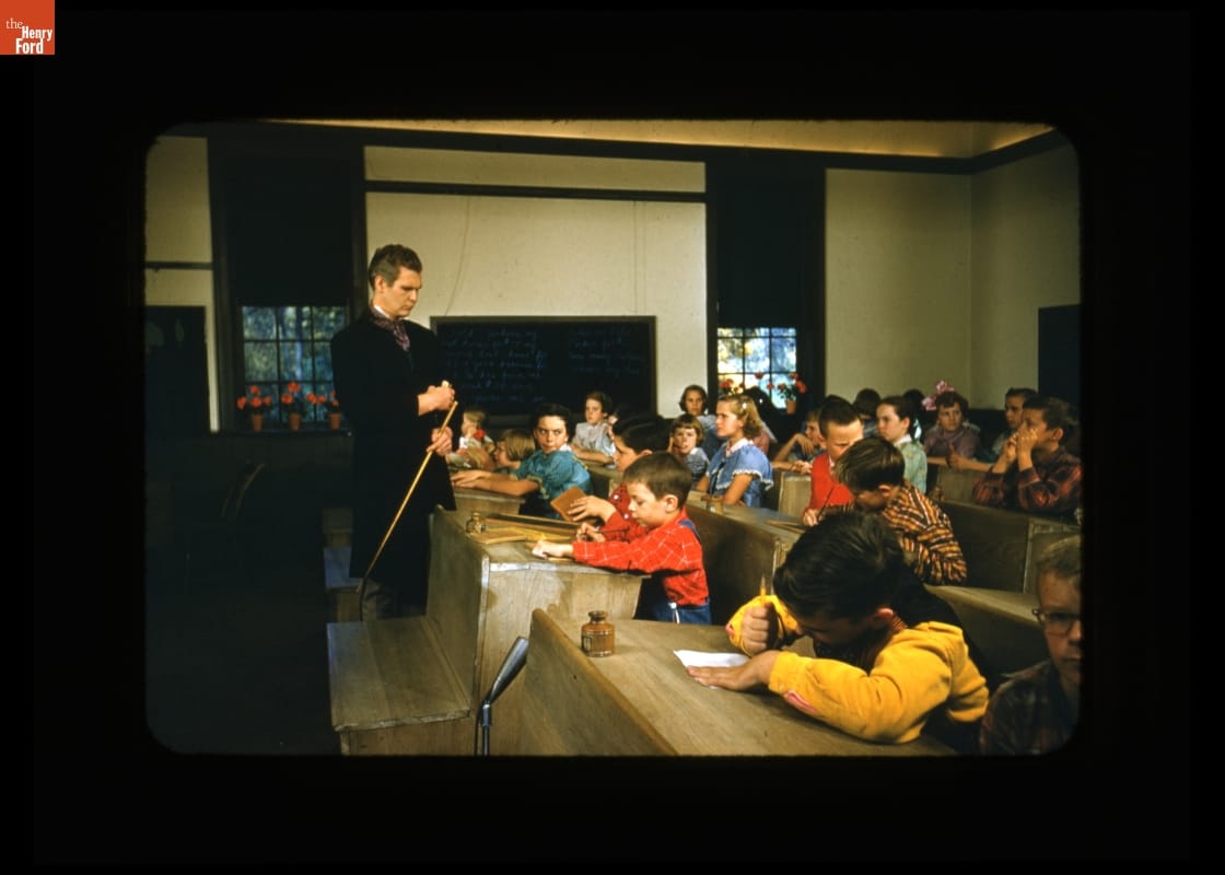 "Say kids, what time is it?" On October 25, 1955, the Howdy Doody show visited Greenfield Village. It was one of three NBC television programs broadcasted live and in color from the Village that day. The groundbreaking children's show aired a segment from the Scotch Settlement School. Cast and students from the Village school demonstrated the differences between school days in 1855 and 1955.
