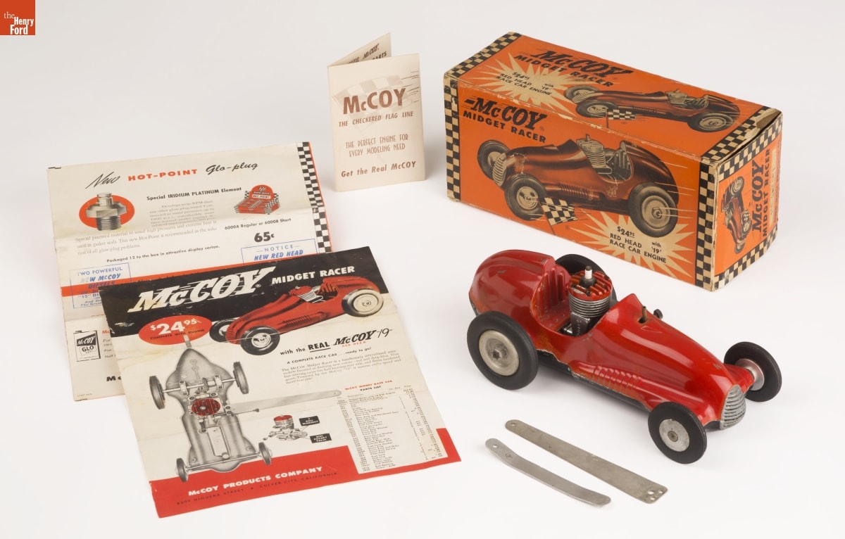 Tether cars, gas-powered model race cars, were popular in the 1930s and 1940s. They were raced individually while tethered to a central pivot, or against each other on a scaled-down board track. This kit, from the McCoy Products Company of Culver City, California, includes a roadster and an engine. The two-stroke engine ran on white gasoline mixed with oil.