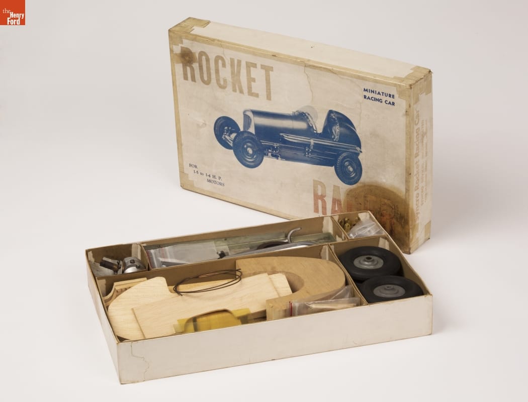 Tether cars, gas-powered model race cars, were popular in the 1930s and 1940s. They were raced individually while tethered to a central pivot, or against each other on a scaled-down board track. Syncro Devices, Inc., of Detroit, Michigan, made this model kit of an open-cockpit racer about 1938. Syncro built approximately 75-100 kits during its two years in production.