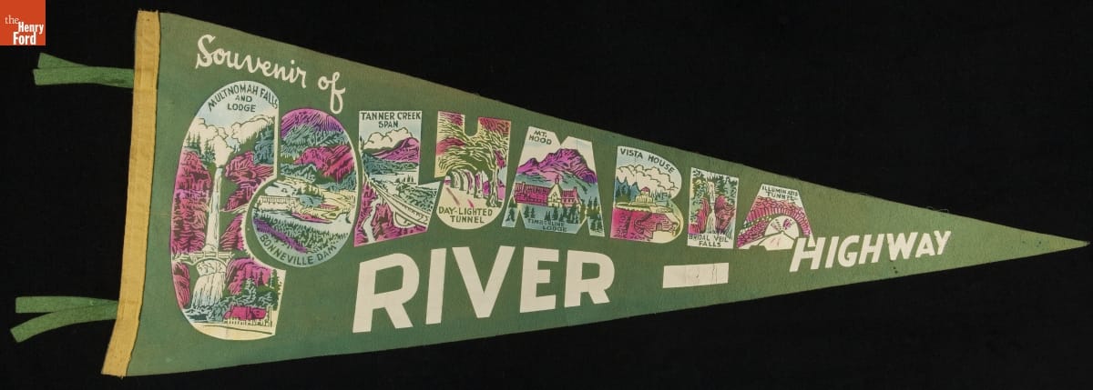 After World War II, highways were flooded with family vacationers out to enjoy their new cars and all that America had to offer. Sometimes the road traveled was part of the journey. Oregon's Columbia River Highway offered numerous scenic vistas for the auto tourist. Attractions depicted in the letters on this souvenir pennant helped vacationers relive their driving experience.