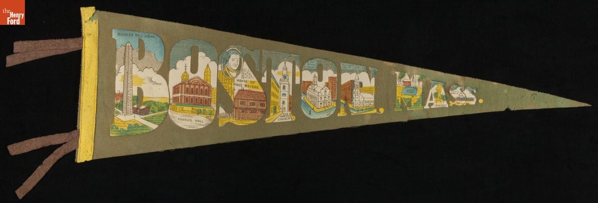 Tourists purchase simple, inexpensive souvenirs as proof of their travels. These mementos transport vacationers back to the places they visited and the things they did. In the mid-20th century, felt pennants were trendy. This pennant with local attractions depicted in the letters of the city's name helped vacationers relive their trip to Boston, Massachusetts.