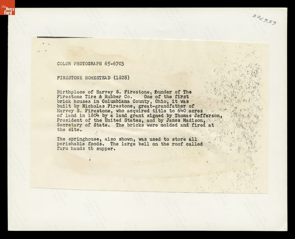 Firestone Farmhouse at Its Original Site, Columbiana County, Ohio, 1965