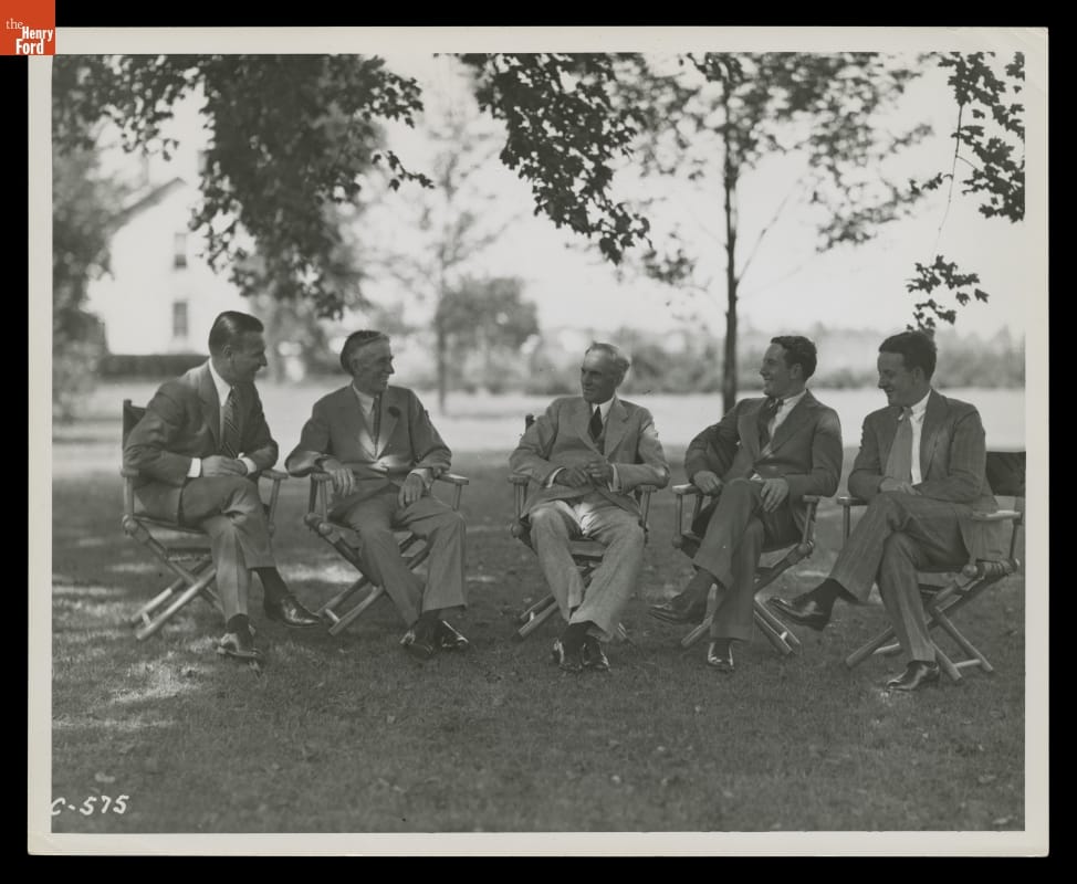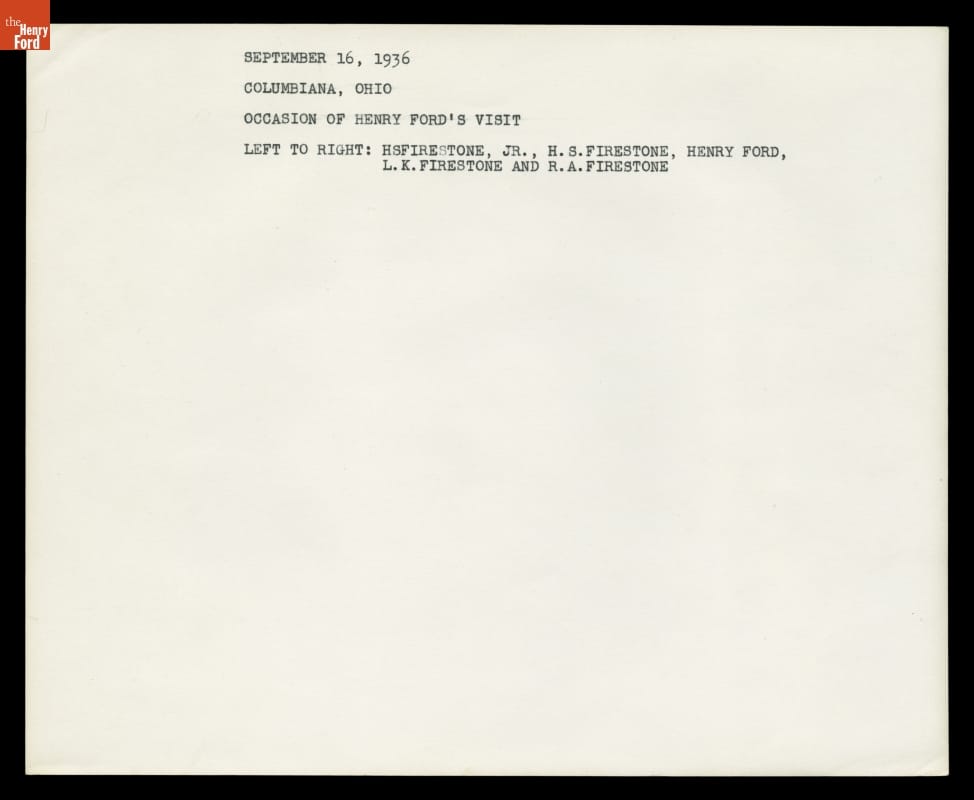 Harvey Firestone, Jr, Harvey Firestone, Henry Ford. Leonard Firestone, Russell Firestone, Columbiana County, Ohio, September 16. 1936