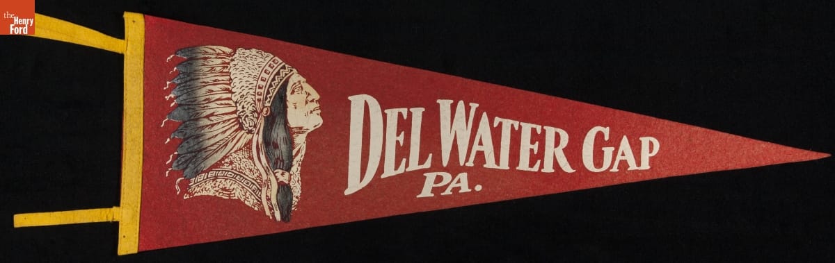 Souvenirs provide tangible proof of a tourist's travels. They also expose the prejudices of the time. This mid-20th century pennant uses a stereotyped image of a Native American. In addition to being culturally incorrect -- feathered headdresses were used by only a small number of Plains tribes -- images like this simply reinforced the discriminatory biases held by many non-Native Americans, purchasers of these souvenirs.
