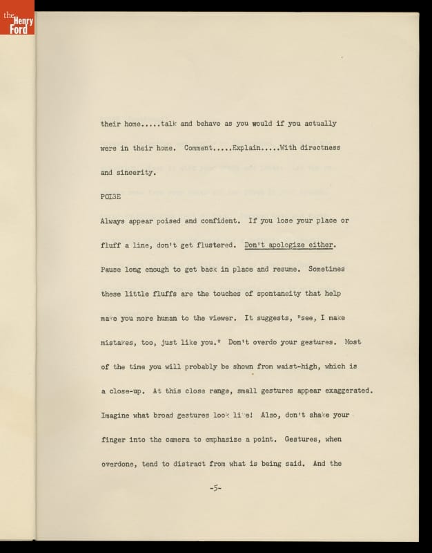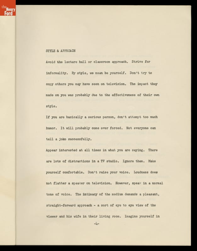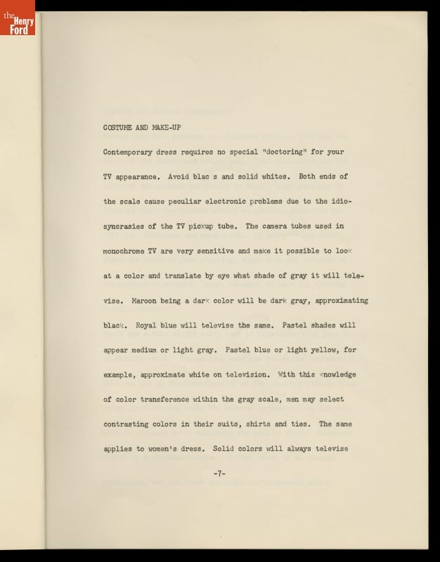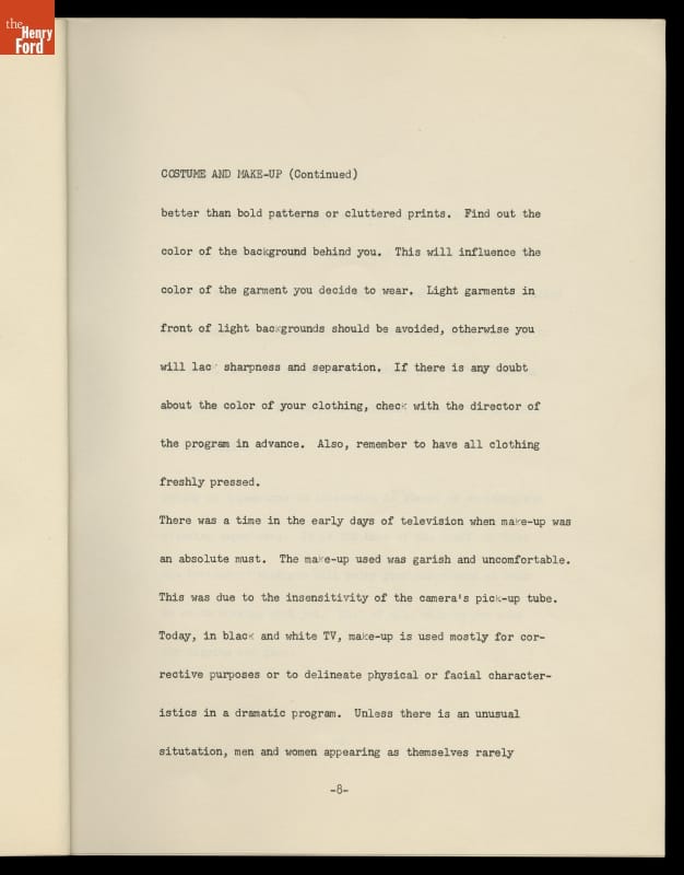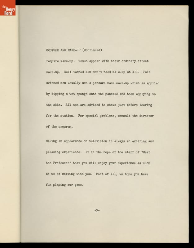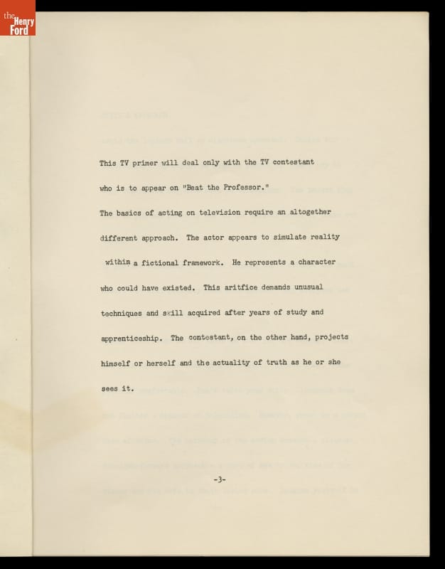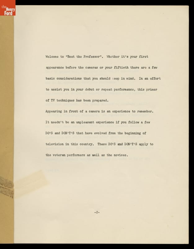 Beat the Professor was the cooperative venture between The Henry Ford Museum and Greenfield Village, Wayne County Schools, Wayne State University and WTVS, Detroit's educational television station. The history quiz show pitted two eighth-grade students against two of their teachers. The program debuted in 1963. This "Primer for TV Techniques" provided contestants with some "Dos" and "Don'ts" about appearing on television.