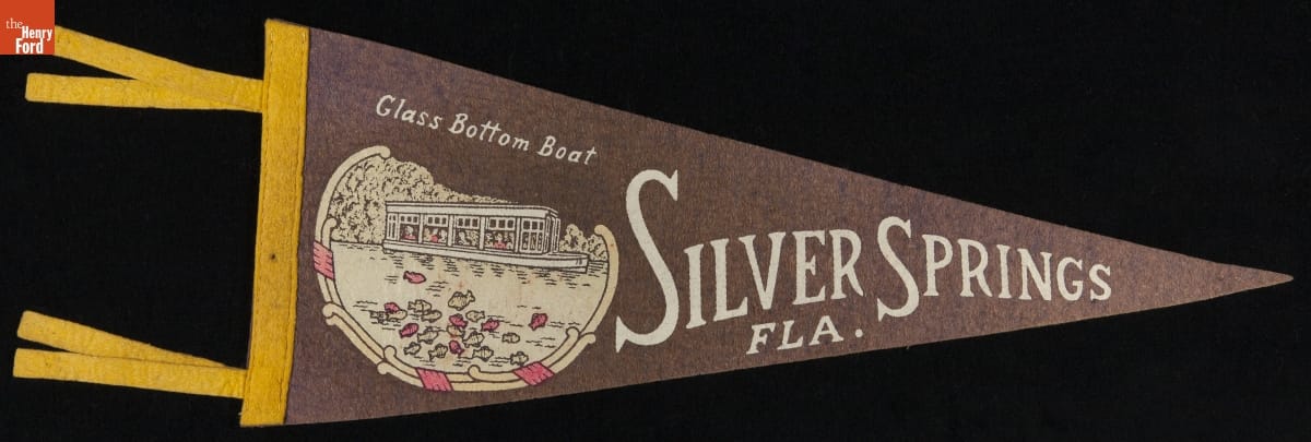 Silver Springs, Florida, became a resort destination after the Civil War. In the 1890s, glass-bottom boat tours (which are still available today) gave visitors a chance to view the springs' aquatic inhabitants. By the mid-20th century, the springs drew in the growing number of auto tourists. These vacationers could purchase inexpensive souvenirs like this pennant to remember the time they peered into the springs' clear waters.