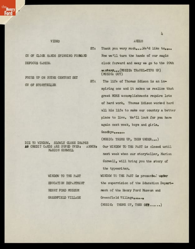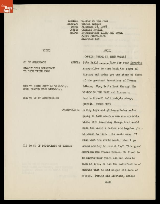 Beginning in the 1950s, Henry Ford Museum and Greenfield Village partnered with WTVS, Detroit's local educational television station, to bring American history into the classroom. Window to the Past was a 15-minute weekly series created and hosted by Marion Corwell, the museum's Manager of Educational Television. The February 28, 1956 episode introduced students to Thomas Edison and his famous inventions.