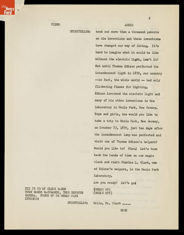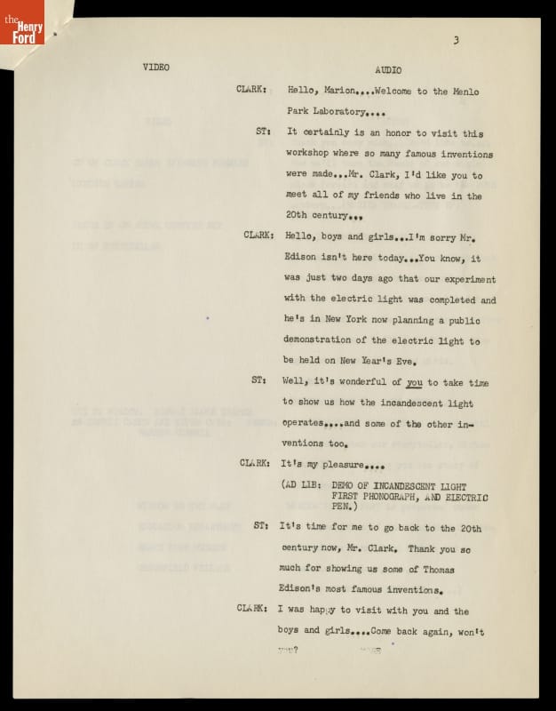 Script for "Window to the Past" Television Show Filmed in Menlo Park Laboratory, Greenfield Village, February 28, 1956