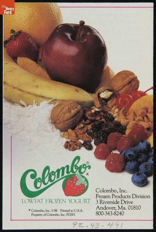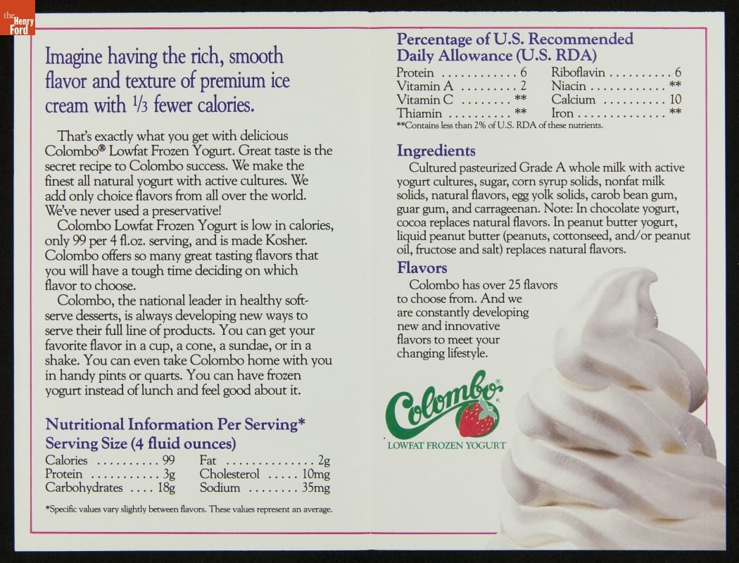 A recent trend in Americans' ice cream choices has been the preference for lowfat, "healthier" alternatives like frozen yogurt, as seen on the cover of this 1988 Colombo brochure. The first wave of frozen yogurt popularity in America occurred during the 1980s. Brands such as Colombo capitalized on the tremendous popularity of TCBY at the time.