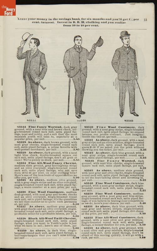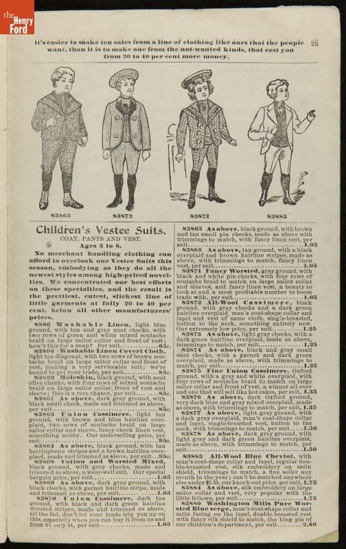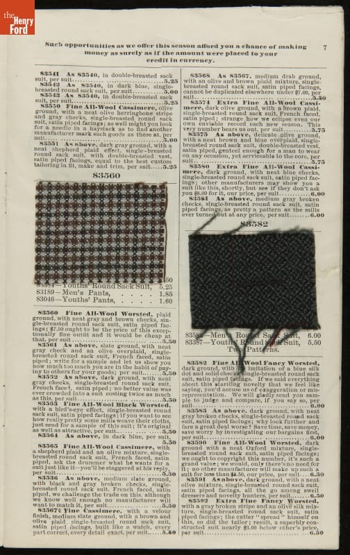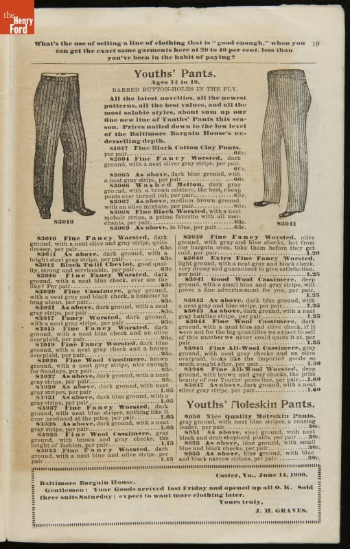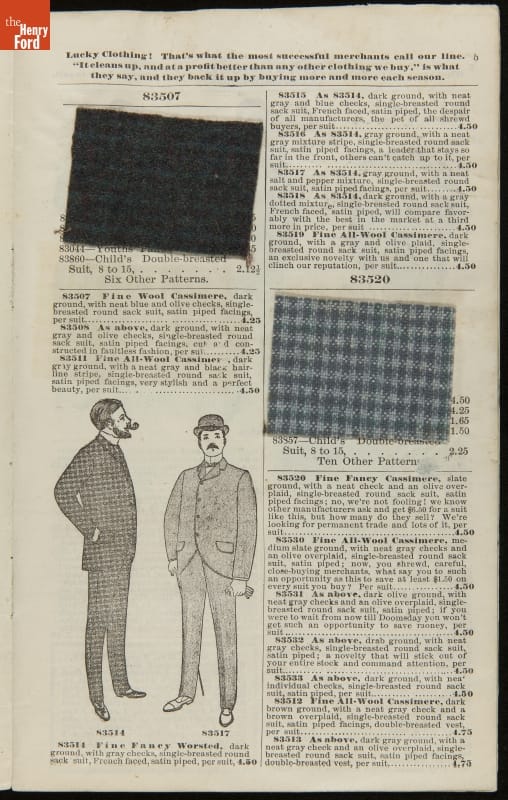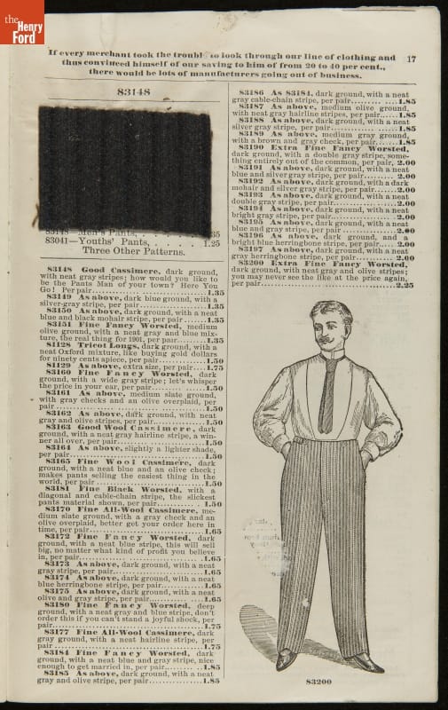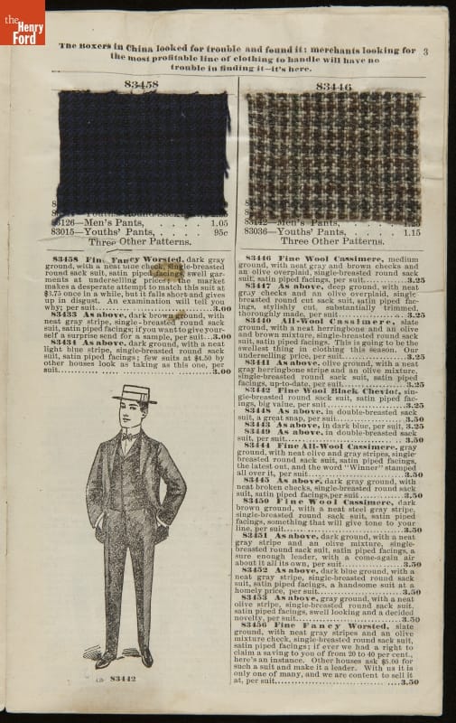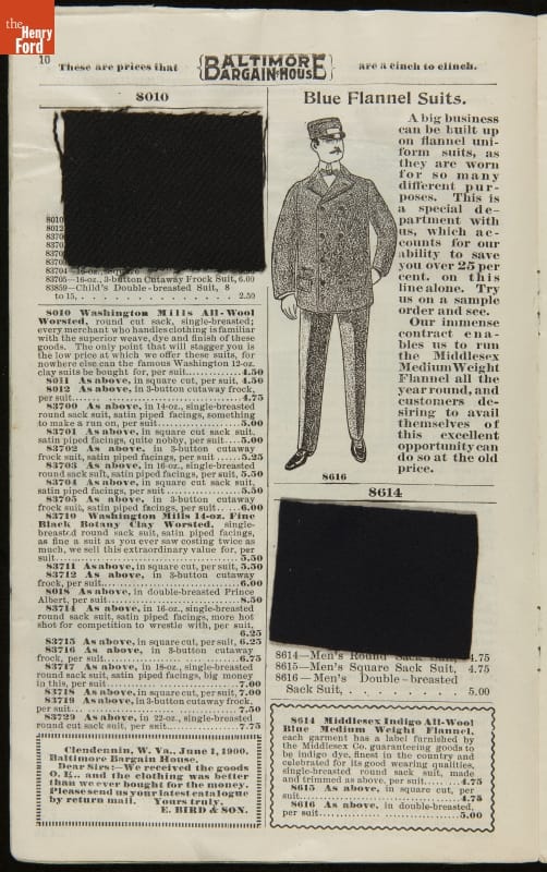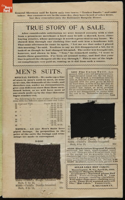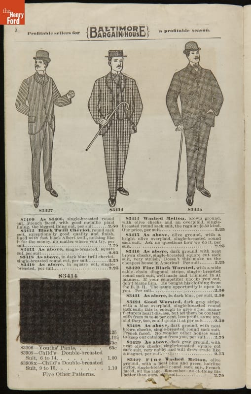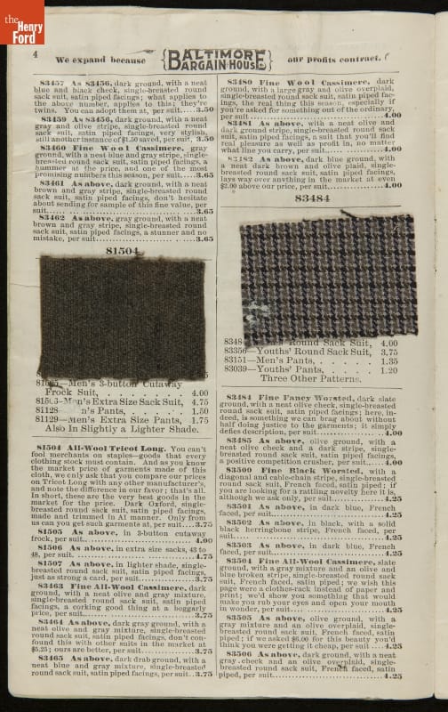 Lithuanian immigrant Jacob Epstein turned his small wholesale store, founded in 1881, into one of the biggest businesses on Baltimore's west side by the turn of the century. Baltimore Bargain House became a hub for Southern Jewish merchants and other local businessmen. Particularly unique to this catalog are the swatches of wool fabric that accompany the descriptions.