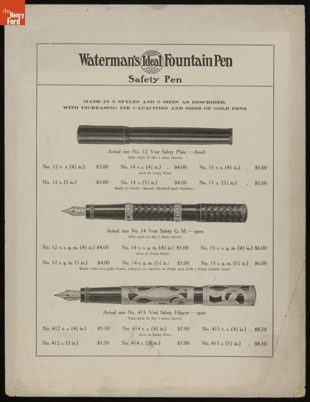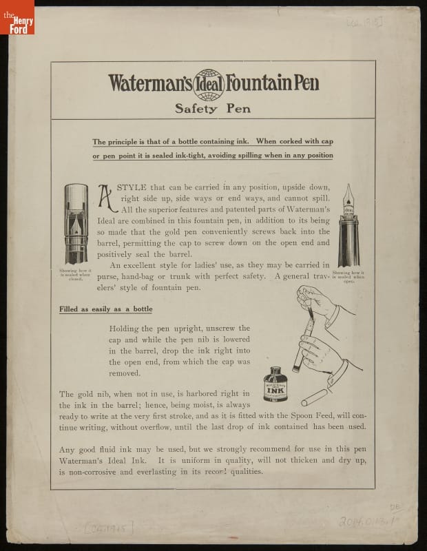 Many pen inventions during the early 20th century attempted to simulate the hollow channel of the goose-feather quill pen but ensure a smooth, controlled flow of ink. For Waterman's Safety Pen, introduced in 1907, the user would fill the barrel with the day's supply of ink using an eyedropper, then screw down the cap to seal the barrel.