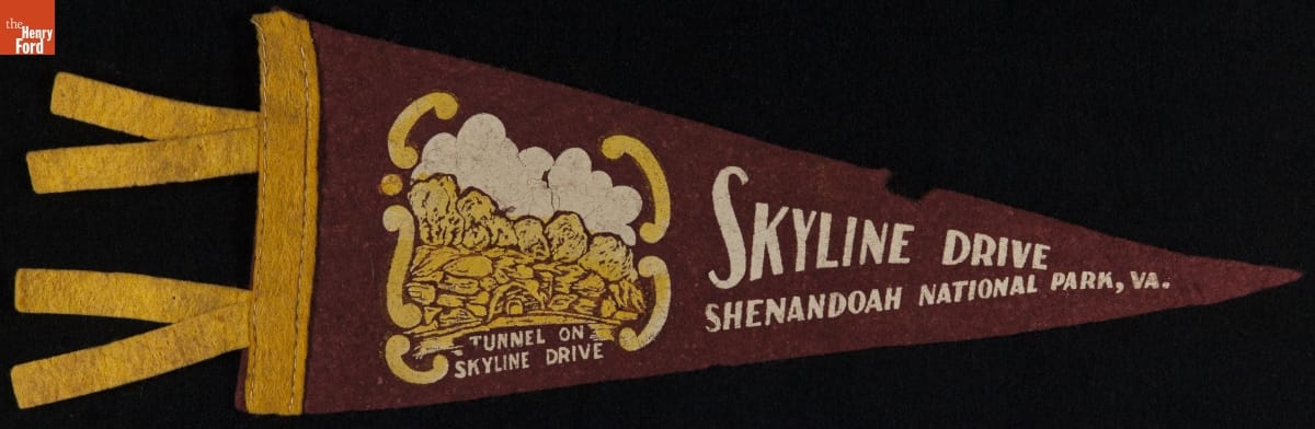 After World War II, highways were flooded with family vacationers out to enjoy their new cars and all that America had to offer. Sometimes the road traveled was part of the journey. Virginia's Skyline Drive offered 105 miles of scenic views along the Shenandoah Blue Ridge. This souvenir pennant depicts the 670-foot-long Marys Rock Tunnel -- the only tunnel on the drive.