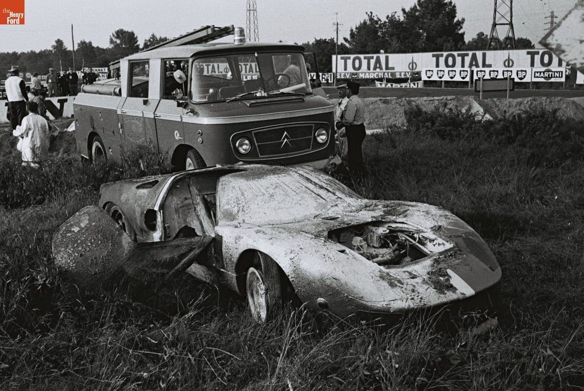 Wreckage of Ford GT40 Driven by Mike Salmon and Brian Redman in the 24 Heures du Mans (24 Hours of Le Mans) Race, June 1967